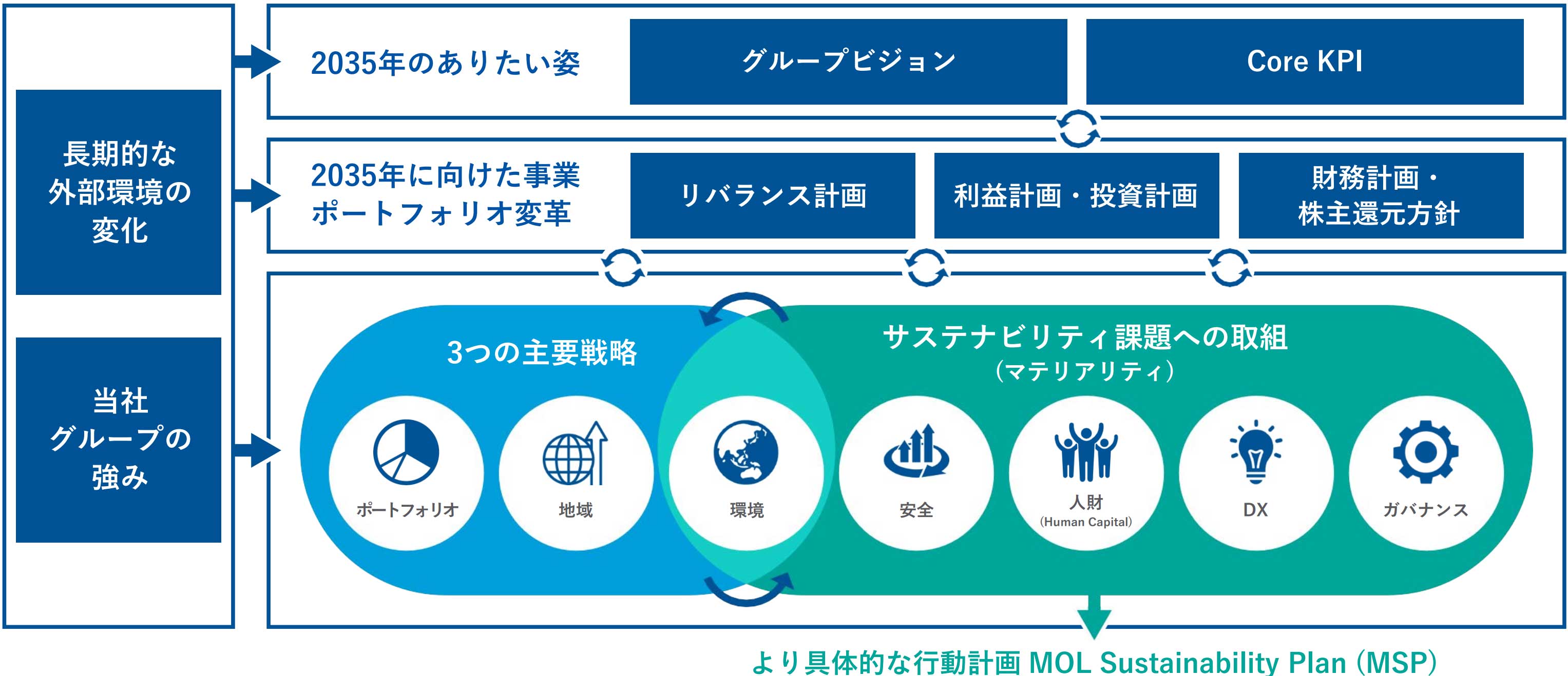 2022年度は、経営計画「Rolling Plan 2022」とサステナビリティ計画「MOL Sustainability Plan(MSP)」を、グループビジョン実現に向けた事業活動の両輪として位置づけましたが、「BLUE ACTION 2035」ではそれぞれの要素を融合させ、サステナビリティ経営の性格をより強く表現しています。商船三井グループのサステナビリティ経営は、長期的な戦略に基づき、社会課題や環境面からも受容できる、持続的な成長の実現を目指すものです。