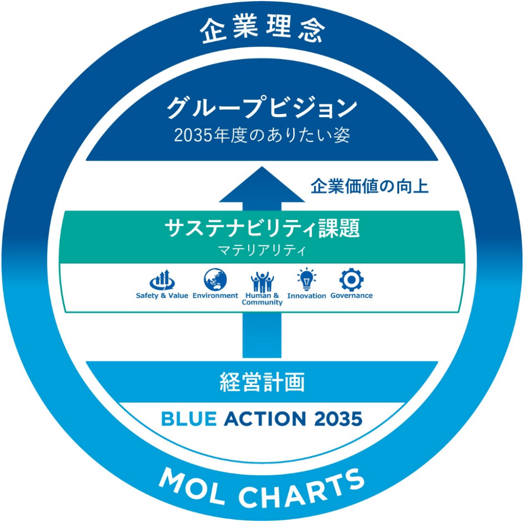 企業理念・行動規範であるMOL CHARTSの精神に沿って「BLUE ACTION 2035」に取組むことで、サステナビリティ課題を解決し、さらには新たな企業価値を創造し、最終的にはグループビジョンの実現へと繋げていきます。