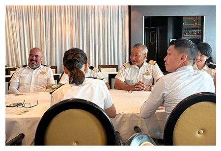 にっぽん丸が世界一周クルーズに出航した年、ソマリア沖を通過することがありました。そのとき近くの海域にいたMOLグループの貨物船が、にっぽん丸と並走してくれることになったのです。安全対策として万全を期すため、わざわざスケジュールを調整し、本来の巡航速度を落としてまで私たちの船に寄り添ってくれました。そして見守りの役目を終えると、貨物船は再び速度を上げて離れていく。その後ろ姿を見て、凛々しさと頼もしさに震えるほど感動しました。日本から遠く離れた海上で、グループの絆がどれほど心強かったか。あのとき感じた誇らしさは、いまも忘れられません。
