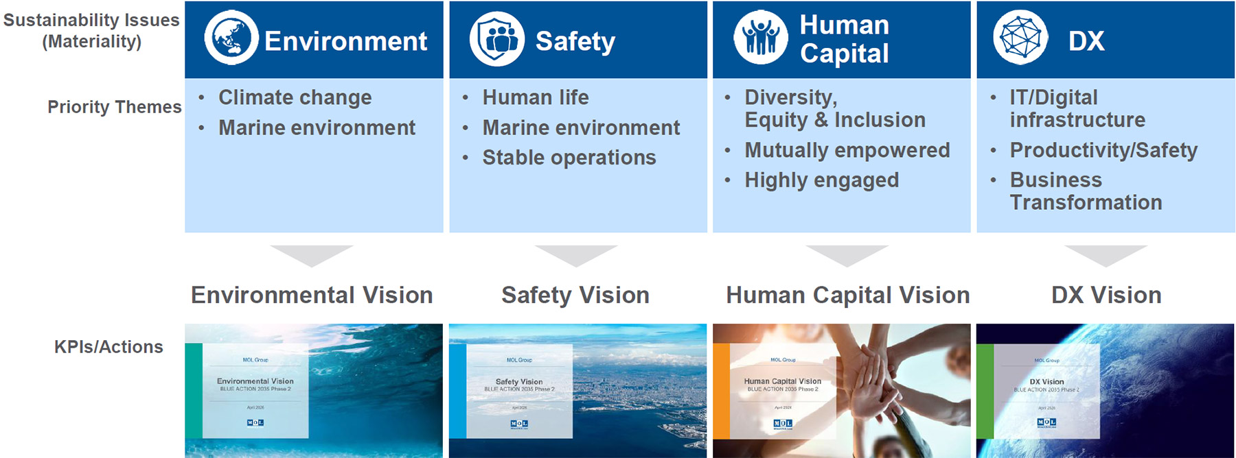In Phase 2 of "BLUE ACTION 2035," MOL reviewed its "Sustainability Issues" (materiality) and organized them to focus on those that make a greater contribution to the creation of economic and social value. It also updated the four thematic visions—Environment, Safety, Human Capital, and Digital Transformation (DX)-linked to each issue. Going forward, MOL will drive initiatives to address these Sustainability Issues, using the KPIs and actions defined under each vision as a foundation, thereby further strengthening its management foundation.