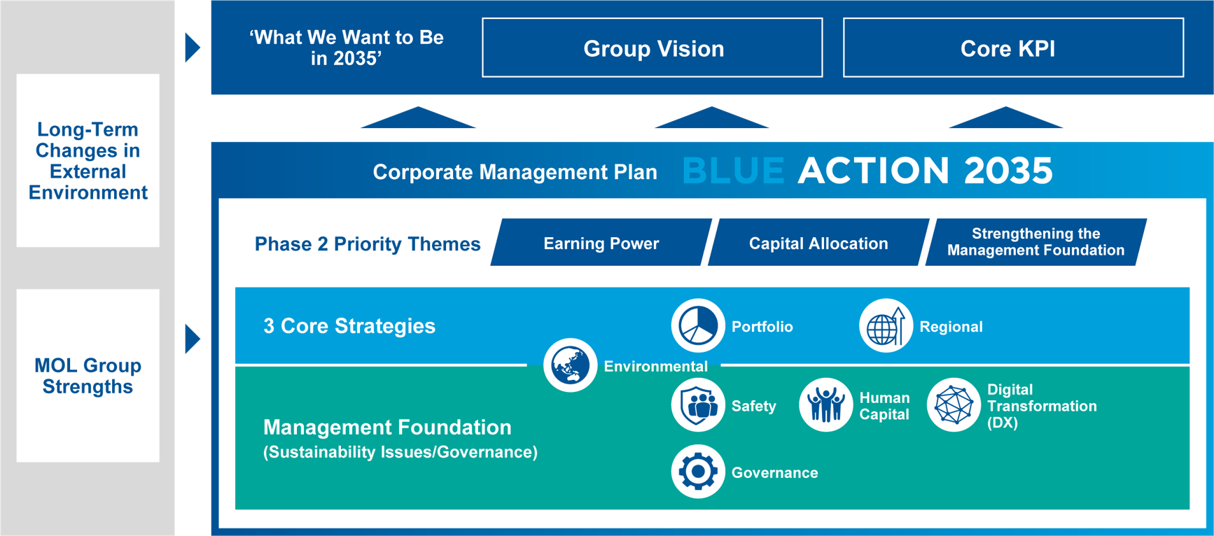 "BLUE ACTION 2035" integrates MOL's management plan with its sustainability initiatives to achieve sustainable growth based on long term strategies. In Phase 2, MOL will advance this approach by embedding "Sustainability Issues" (materiality) and governance into the management plan itself as core elements of its management foundation. This will enable the group to create economic and social value in an integrated manner and enhance corporate value. Guided by MOL CHARTS-the group's corporate philosophy, values, and code of conduct-MOL will promote "BLUE ACTION 2035" and connect these efforts to the realization of the Group Vision.