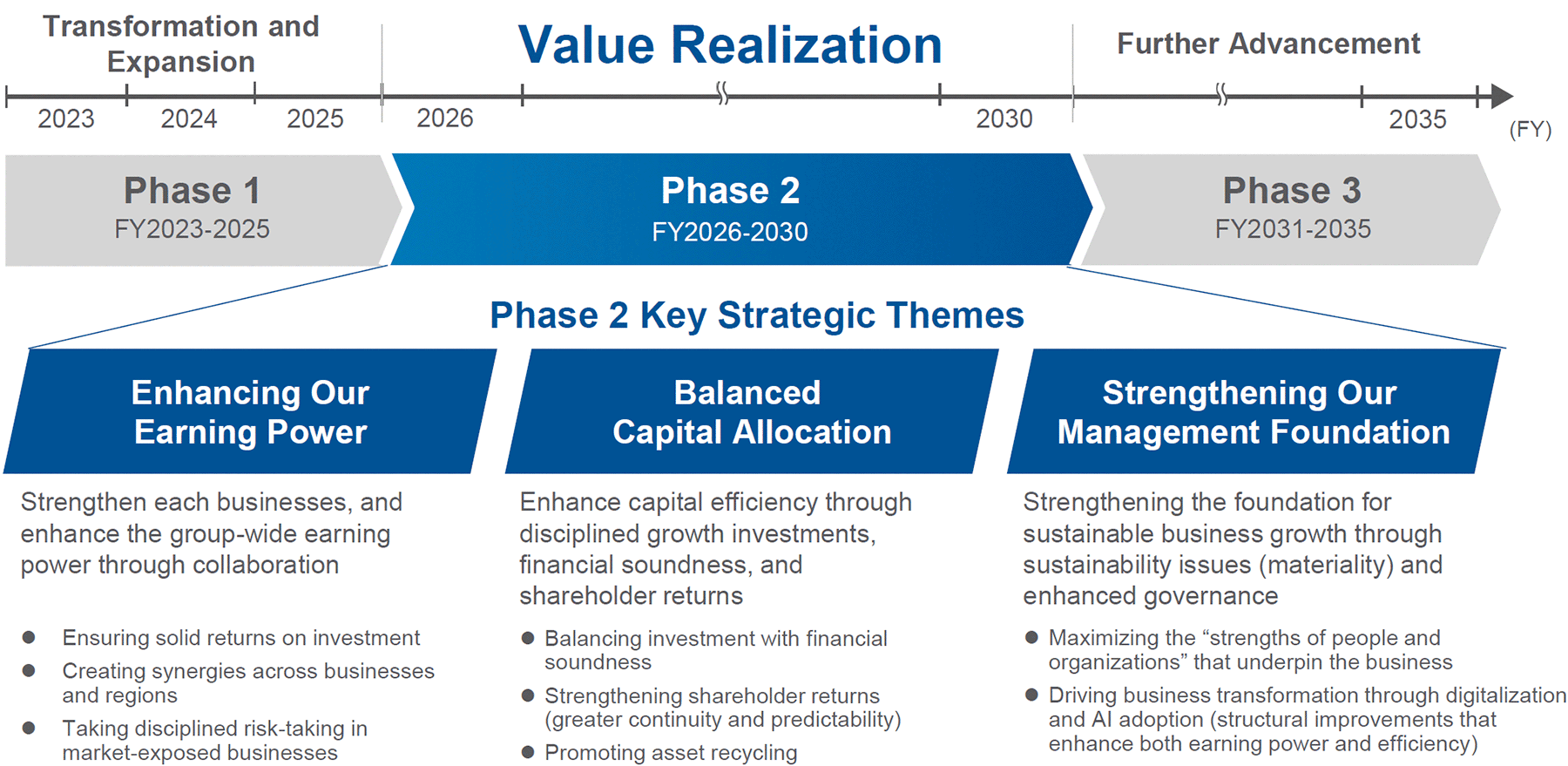 In Phase 2 of "BLUE ACTION 2035," MOL will shift its management focus from the "Transformation and Expansion" of Phase 1 to "Delivering Results," and establish three priority themes.