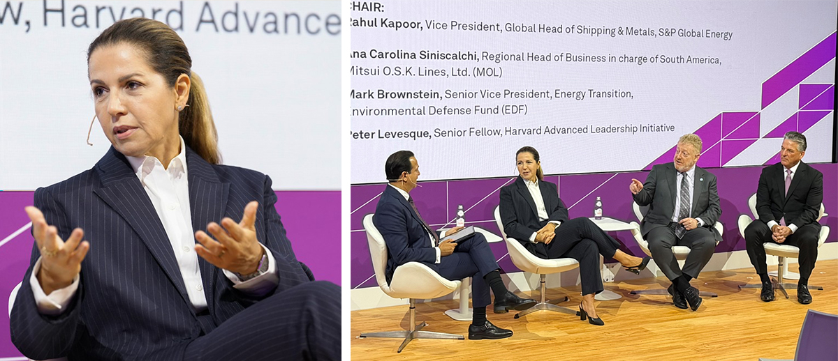 In this session, which focused on solutions for decarbonization in the shipping sector, Ana Carolina Siniscalchi as Regional Head of Business in charge of South America, participated as a speaker and outlined our initiatives. She noted that, in the short term, MOL is working to reduce greenhouse gas emissions and fuel consumption by expanding the introduction of LNG-fueled vessels, utilizing the Wind Challenger, wind-assisted ship propulsion system, and promoting more efficient vessel operations.