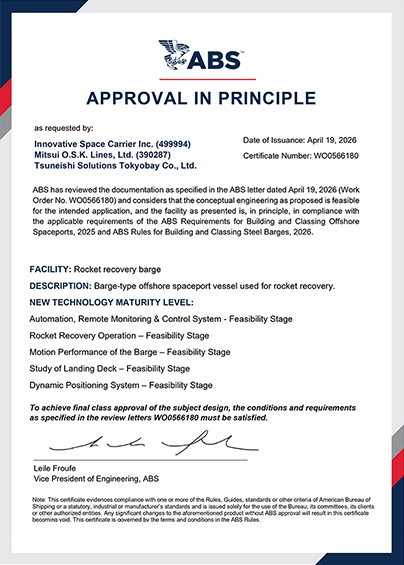 TOKYO-Mitsui O.S.K. Lines, Ltd. (MOL; President & CEO: Jotaro Tamura) today announced that MOL and its partners (Note 1), Innovative Space Carrier, Inc. (ISC: CEO: Kojiro Hatada) and TSUNEISHI SOLUTIONS TOKYOBAY Co., Ltd. (President: Kenichi Shibata) have obtained Approval in Principle (AiP) (Note 2) from the American Bureau of Shipping (ABS) for the basic design of an unmanned autonomous rocket recovery vessel. Drawing on the expertise and safe navigation technologies we have cultivated in the shipping and offshore businesses, MOL will continue to advance studies toward the implementation of the offshore rocket recovery vessel.
