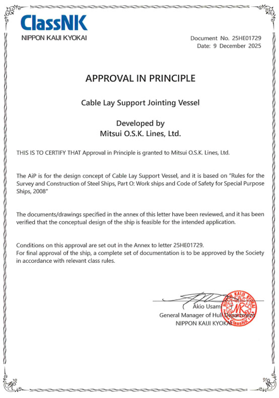 TOKYO-Mitsui O.S.K. Lines, Ltd. (MOL; President & CEO: Takeshi Hashimoto) today announced that it has obtained approval in principle (AiP) (Note 1) from Nippon Kaiji Kyokai (ClassNK) (President & CEO: Hayato Suga, Headquarters: Chiyoda-ku, Tokyo) for the basic design of specialized vessels to joint and bury subsea power cables(Note 2).