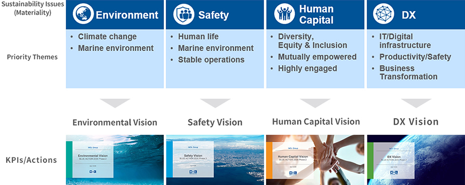 In Phase 2 of "BLUE ACTION 2035," MOL reviewed its "Sustainability Issues" (materiality) and organized them to focus on those that make a greater contribution to the creation of economic and social value. It also updated the four thematic visions-Environment, Safety, Human Capital, and Digital Transformation (DX)-linked to each issue. Going forward, MOL will drive initiatives to address these Sustainability Issues, using the KPIs and actions defined under each vision as a foundation, thereby further strengthening its management foundation.