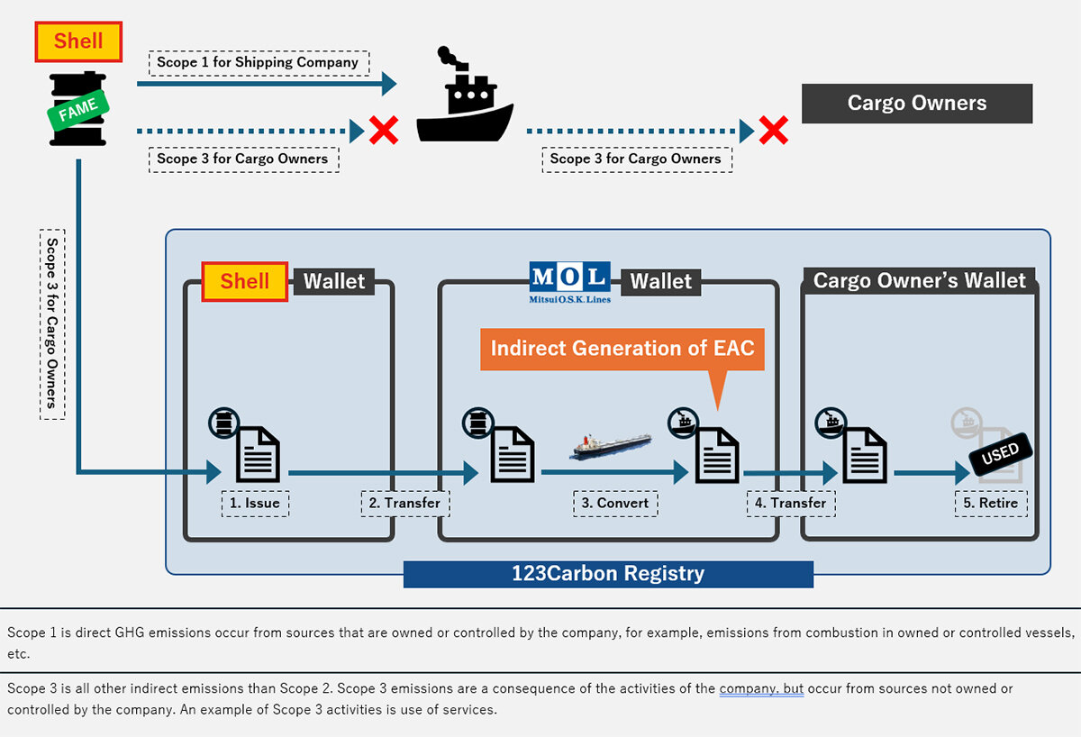MOL received the lifecycle GHG emission reduction value for the cargo owners allocated by Shell and, following verification in line with the MBM Framework, converted it into EACs.