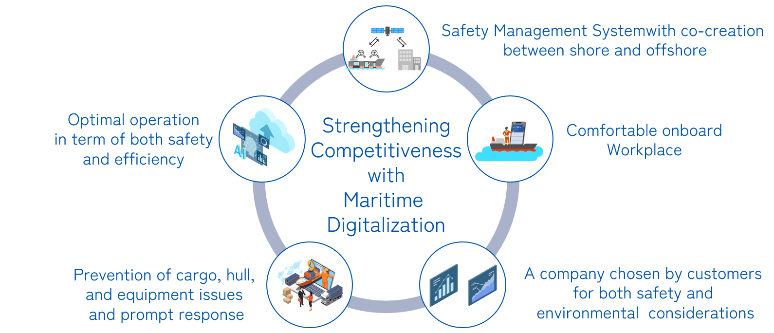 Our company has been actively strengthening our IT and digital infrastructure to promote maritime digitalization and DX, including dramatically improving onboard communication environments through the introduction of low-orbit satellites. While continuing to enhance the infrastructure, we aim to accelerate the digitalization and DX of maritime operations by leveraging AI and data utilization. By realizing initiatives in five key areas, we strive to enhance our competitiveness through maritime digitalization.