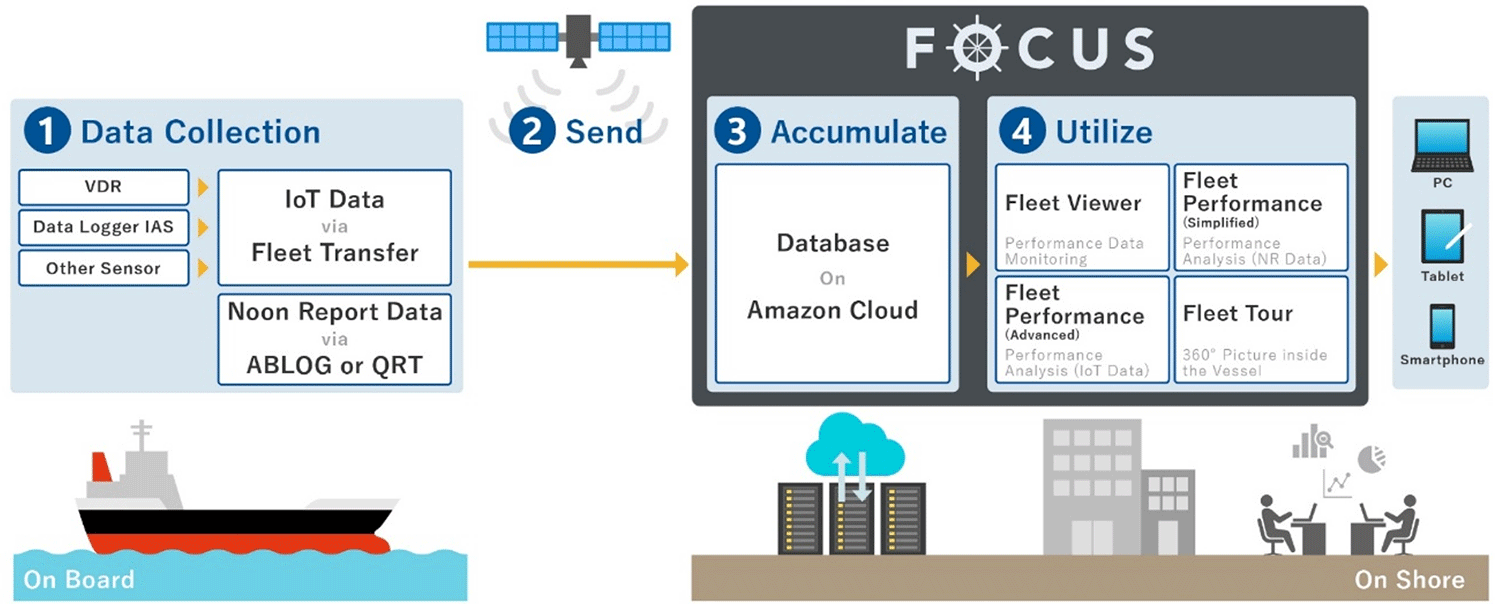 FOCUS is a system designed to centrally visualize and analyze data from ships operating in actual sea conditions, with the aim of enhancing safety and achieving more efficient operations.
