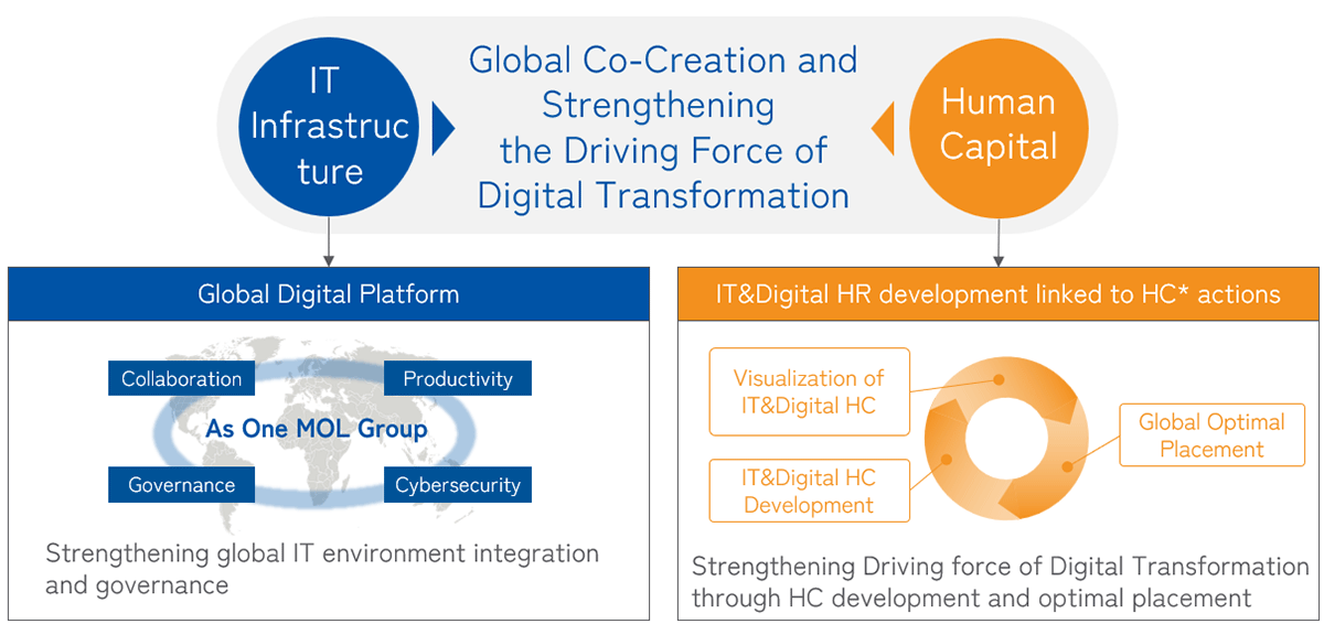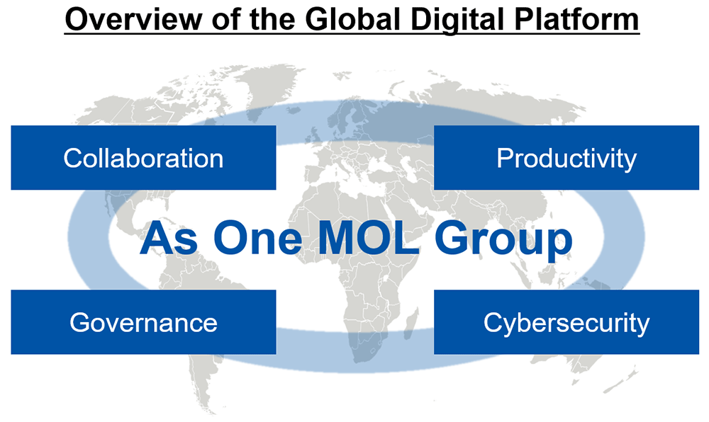 By integrating business and IT infrastructure on a global scale, MOL aims to strengthen collaboration, productivity, governance, and security. Additionally, through the strategic development and optimal global allocation of IT and digital human resources, our goal is to enhance the driving force of global co-creation and digital transformation (DX) by reinforcing both the "IT infrastructure" and "Human Resource" pillars.