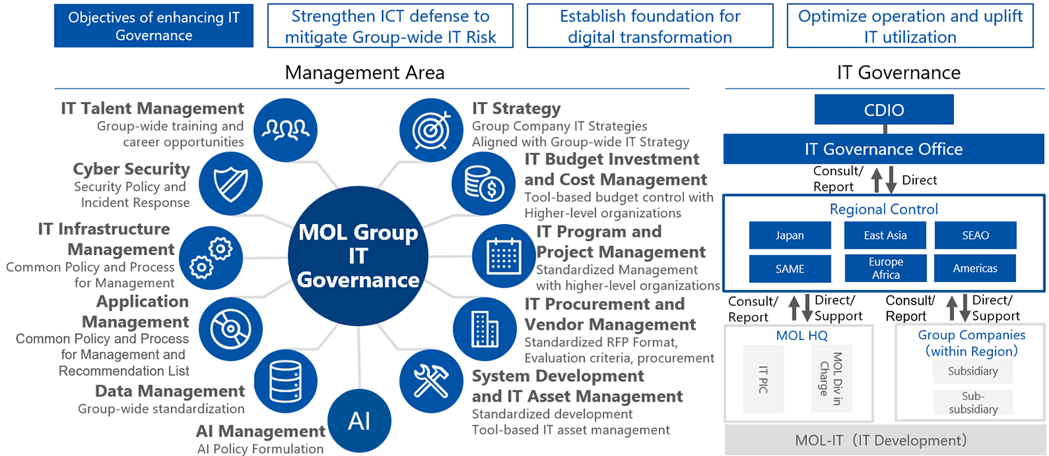 The MOL Group is promoting initiatives to enhance its IT governance framework across the Group. As generative AI technologies evolve rapidly and the importance of data utilization in business continues to rise, there is increasing demand to realize a globally efficient and highly reliable IT environment. In response, the Group aims to "Strengthen IT defense", "Establish foundation for digital transformation" and "Optimize operation and uplift IT utilization".