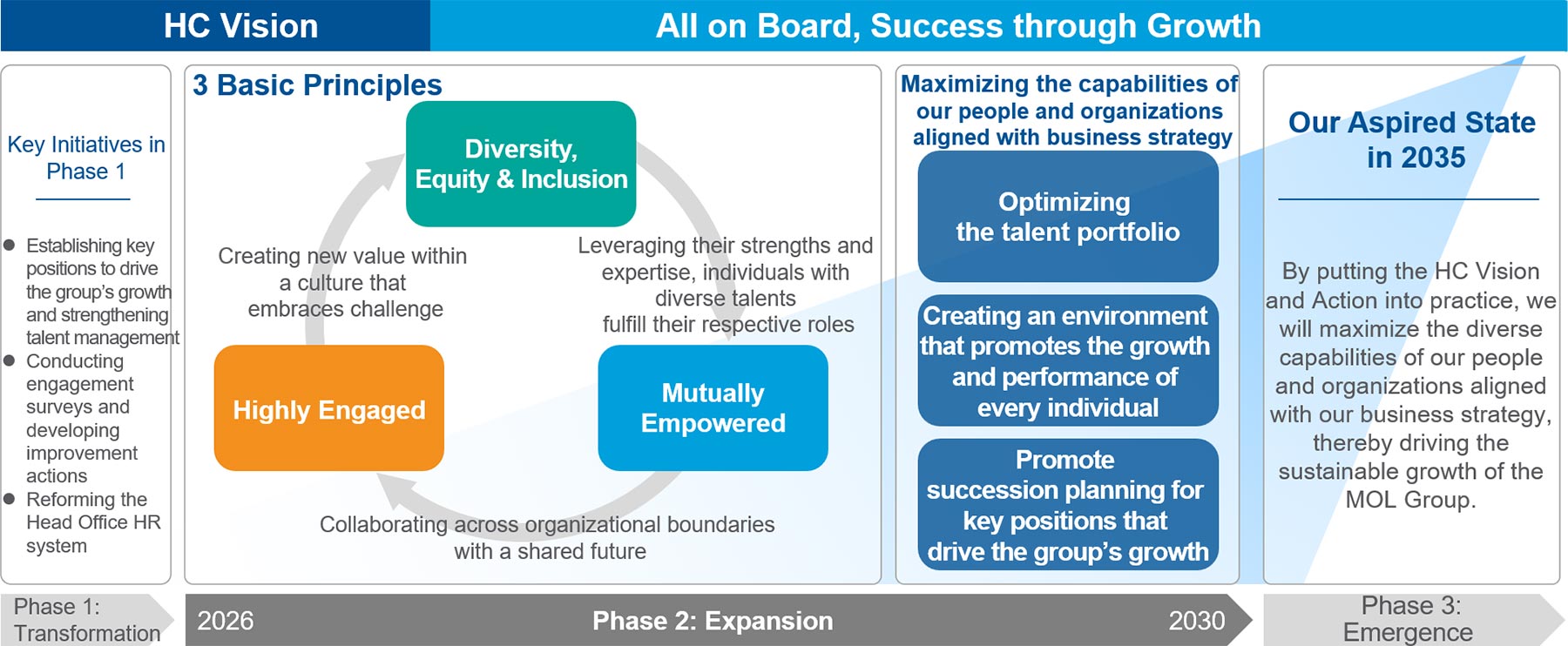 Based on the theme "All on Board, Success through Growth" in the HC Vision, MOL Group established three basic principles "Diversity, Equity & Inclusion," "Mutually Empowered" and "Highly Engaged," as the basic principles of the group's human capital policy. By creating a positive cycle based on these three basic principles, we aim to achieve the sustainable growth of both individuals and the company, ultimately delivering value to all stakeholders.