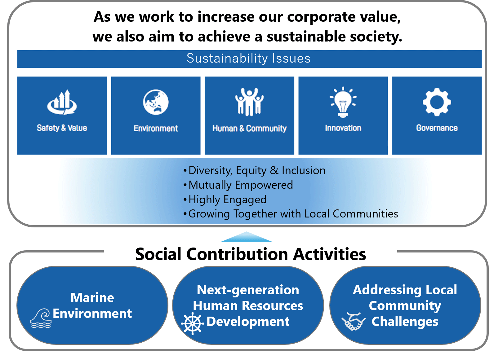 In terms of specific activities, we have set "Marine Environment," "Next-generation Human Resources Development," and "Addressing Local Community Challenges" as priority areas, and develop activities suited to each country and region in which we are involved in our business, developing the strengths of our group. In addition, we strive to promote and improve the group's social contribution activities by disclosing the details of our activities and communicating with society.