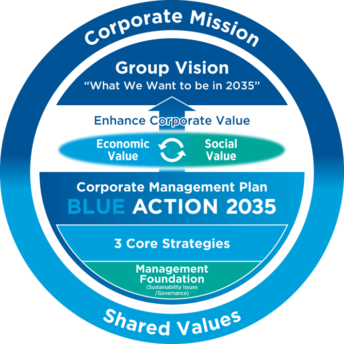 Under "BLUE ACTION 2035" Phase2, which began in fiscal 2026, in addition to our 3 core strategies (Portfolio, regional and environment), we will focus on the Sustainability Issues (materiality) of the environment, safety, human resources, and DX as the management foundation to support these strategies, as well as a permanent corporate theme of governance.