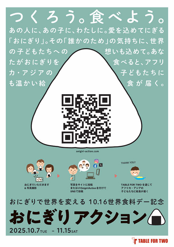 Mitsui O.S.K. Lines, Ltd. (MOL; President & CEO: Takeshi Hashimoto) will participate as a supporting partner in the international social contribution activity "Onigiri Action 2025," organized by the non-profit organization TABLE FOR TWO International(TFT) (Note 1). This initiative commemorates October 16, "World Food Day," designated by the United Nations as a day to reflect on global food issues. During the campaign period, posting photos of rice balls (onigiri) on SNS (X, Instagram, Facebook) or the special campaign website will help deliver school meals to children in Africa and Asia. Anyone can participate for free, and for each photo posted, five school meals will be donated through TABLE FOR TWO by sponsoring companies.