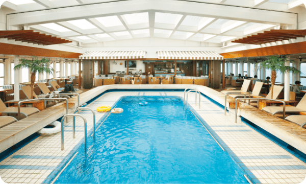 The Nippon Maru, thanks to its compact size, can call at a variety of ports, including charming, out-of-the-way islands. This feature, along with its attentive hospitality and meticulously prepared cuisine, creates a sense of closeness with passengers, contributing to its excellent reputation in the cruise market.![]() Swimming pool Swimming pool