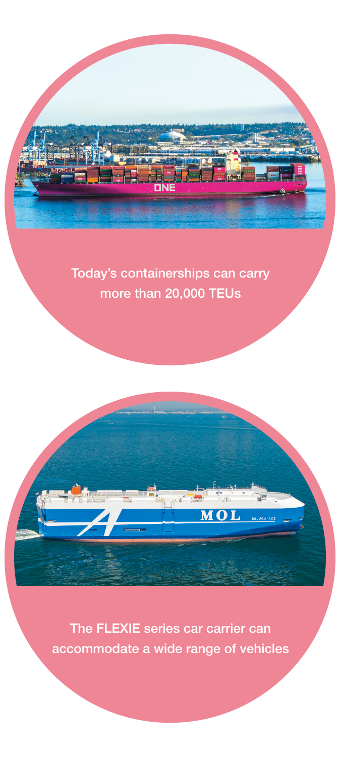 This section introduces car carriers that transport automobiles and containerships that carry a wide variety of cargoes such as apparel,