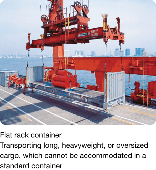 These vessels carry cargoes that are loaded into international standard shipping containers. Shipping routes and schedules are set in advance like bus or train services, and vessels periodically call at predetermined ports. In addition, containerized cargoes can be swiftly and easily reloaded to trucks and rail cars, making it possible to provide integrated door-to-door transport service.