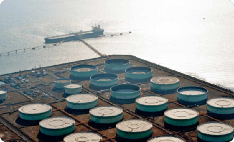 ![]() Crude oil storage tanks with a tanker in the background Crude oil storage tanks with a tanker in the background