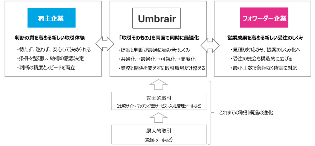 Umbrairは、荷主とフォワーダーのやり取りをオンライン上で一元化し、双方が同じ情報をもとにスムーズに取引できる環境を提供します。それぞれの意思と判断を正しく噛み合わせることで、手間を減らし、より迅速で確実な取引を可能にします。