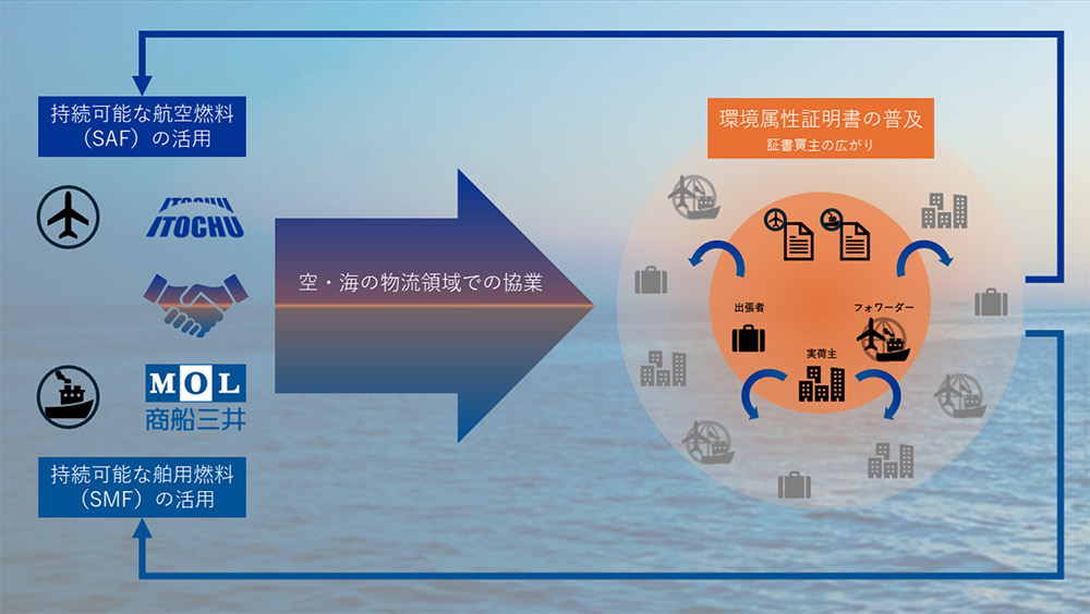 国内外の多くの企業にとって大きな割合を占めるScope3排出量の削減は、気候変動への対応を進めるうえで喫緊の課題ですが、サプライチェーンが複雑である為トレーサビリティ確保の難しさなどが障壁となっています。商船三井は船舶用低炭素燃料の使用により、伊藤忠商事はSAFの利用により、双方の強みを生かした海・空の物流領域での協業を通じて、輸送サービスを利用する企業のScope3削減を支援する仕組みを構築し、輸送サプライチェーン全体での連携による脱炭素の実現に取り組んでまいります。