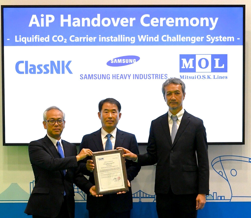 株式会社商船三井(社長:田村 城太郎、本社:東京都港区、以下「当社」)は、ウインドチャレンジャー(硬翼帆式風力推進装置、註1)を3基搭載した液化CO2輸送船(註2)(以下「本船型」)について、一般財団法人日本海事協会(以下「ClassNK」)から、基本設計承認(註3)(Approval in Principle:以下「AiP」)を2026年4月14日に取得しました。本船型は、サムスン重工業株式会社(本社:韓国・ソウル、以下「SHI」)と共同で開発を進めた液化CO2輸送船であり、液化CO2の国際輸送において風力活用による燃料消費量および温室効果ガス(以下「GHG」)排出量の低減を目指しています。