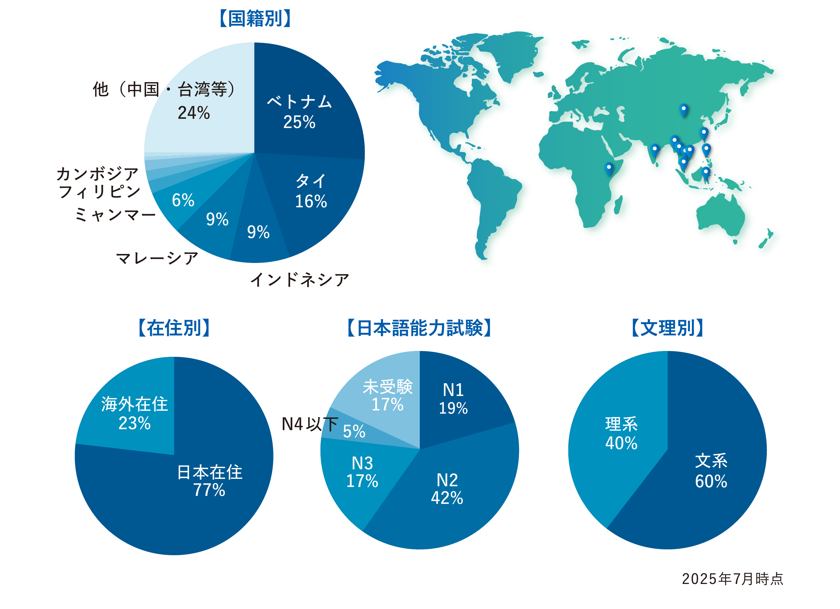 貴社の日本語力のご希望に合った人材をご提案します。ただ、入社し日本人と一緒に働くことで外国人人材の日本語力は大幅に向上しますので、職種によっては日常会話レベルの人材からご検討いただくことをお勧めします。