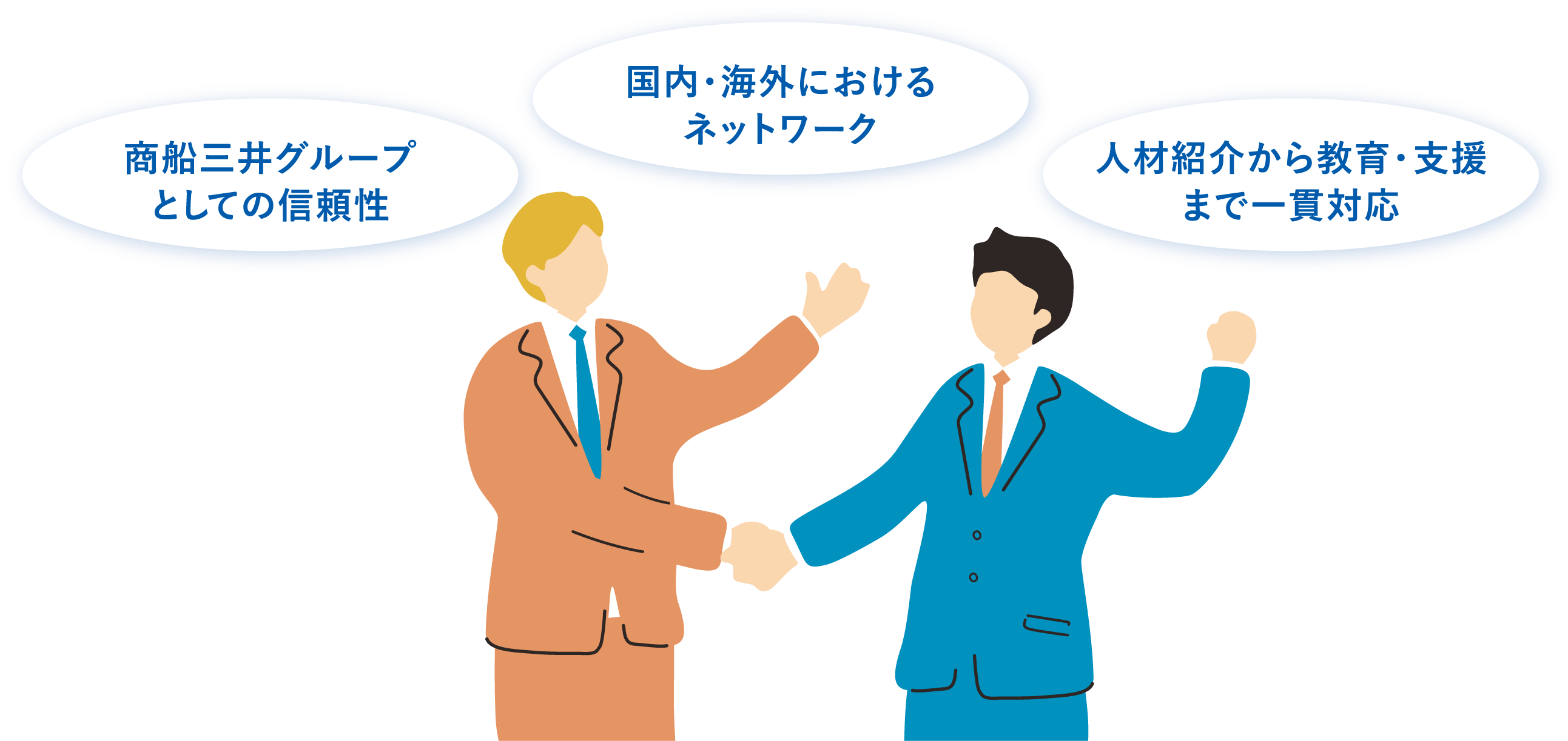 人材採用から採用後の定着支援まで、シームレスな提案型人材紹介サービスです。商船三井グループのネットワークを活かし、企業の人材課題に寄り添い、貴社の窓口として安心してお任せいただけます。
