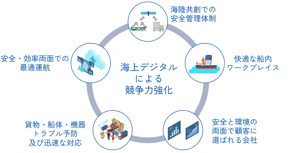 当社は、これまで低軌道衛星導入による海上通信環境の劇的な改善など、海上のDXに向けたIT基盤強化を推進してきました。IT基盤強化を継続するとともに、AIやデータ活用により海上業務のIT化を加速させ、5つの領域の実現を行うことで、「海上DXによる競争力強化」を目指します。