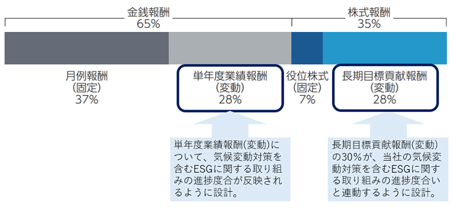当社では、ガバナンスに関する取り組みの一環として、役員報酬制度の中で気候変動関連の成果に連動する仕組みを採用しています。具体的には、代表取締役社長をはじめ各業務執行取締役の評価には、気候変動の対策状況やその他ESGに関する取り組みの進捗度合が反映される仕組みとなっています。
