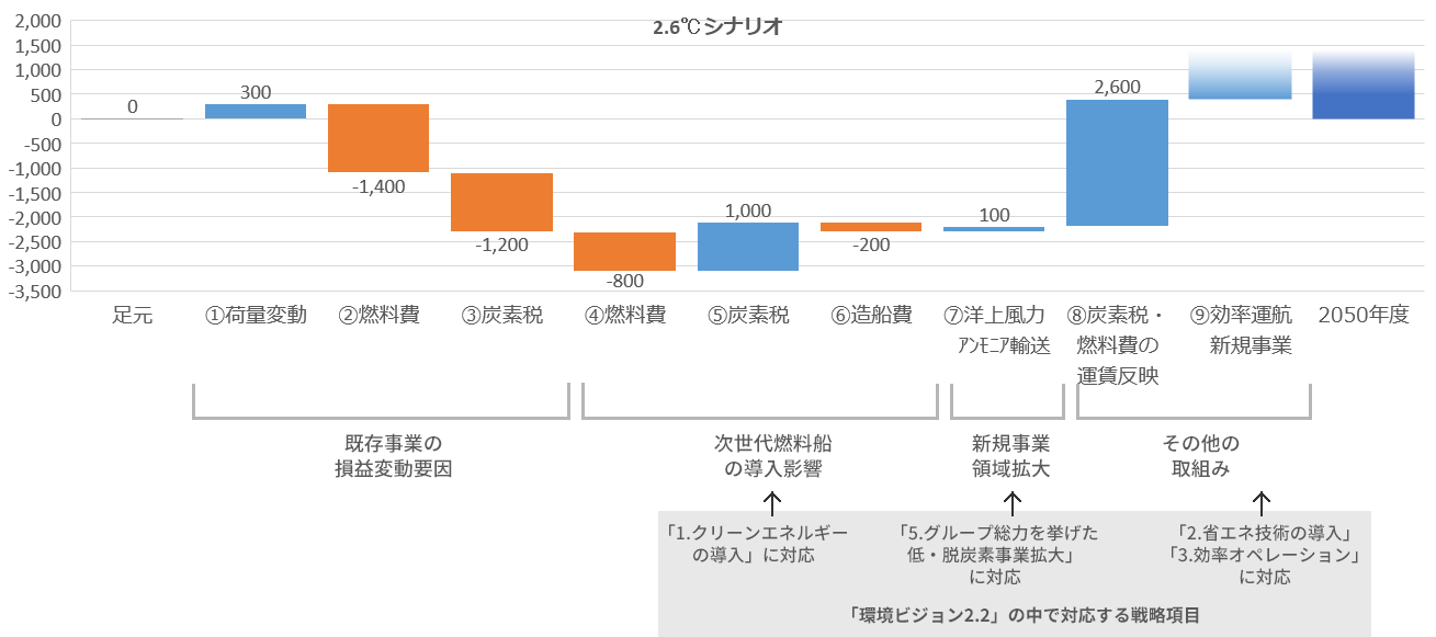 2.6℃シナリオにおいては、化石燃料価格の上昇による燃料コストの増加(▲1,400億円)が大きな収益圧迫要因となりますが、このコスト増加に関しては従来の商慣行に従い競争原理に基づく運賃への反映という形で大部分を広く社会にシェアして頂けるよう取り組みます。また、他の2シナリオと比較すると炭素税の導入によるコスト増加(▲1,200億円)は低いレベルに収まる見込みですが、こちらのコスト増加に関しても、当社の直接排出削減はそのまま顧客企業のサプライチェーン排出削減に直結するという原則に立ち、上記燃料コストと同様の取り組みを進めて参ります。その他の変動要因としては、既存事業部門の荷動き伸長(+300億円)に加え、次世代燃料船の導入によるコスト増の影響緩和、効率運航推進といった取り組みにより、十分な利益水準に到達できる見込みです。