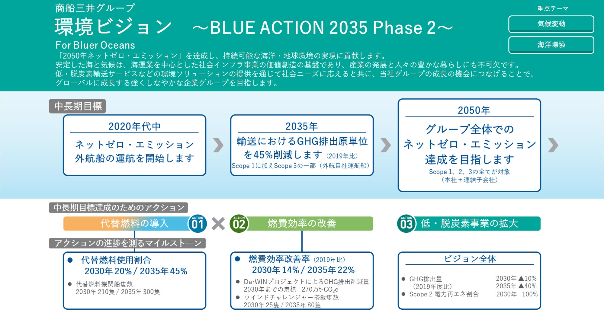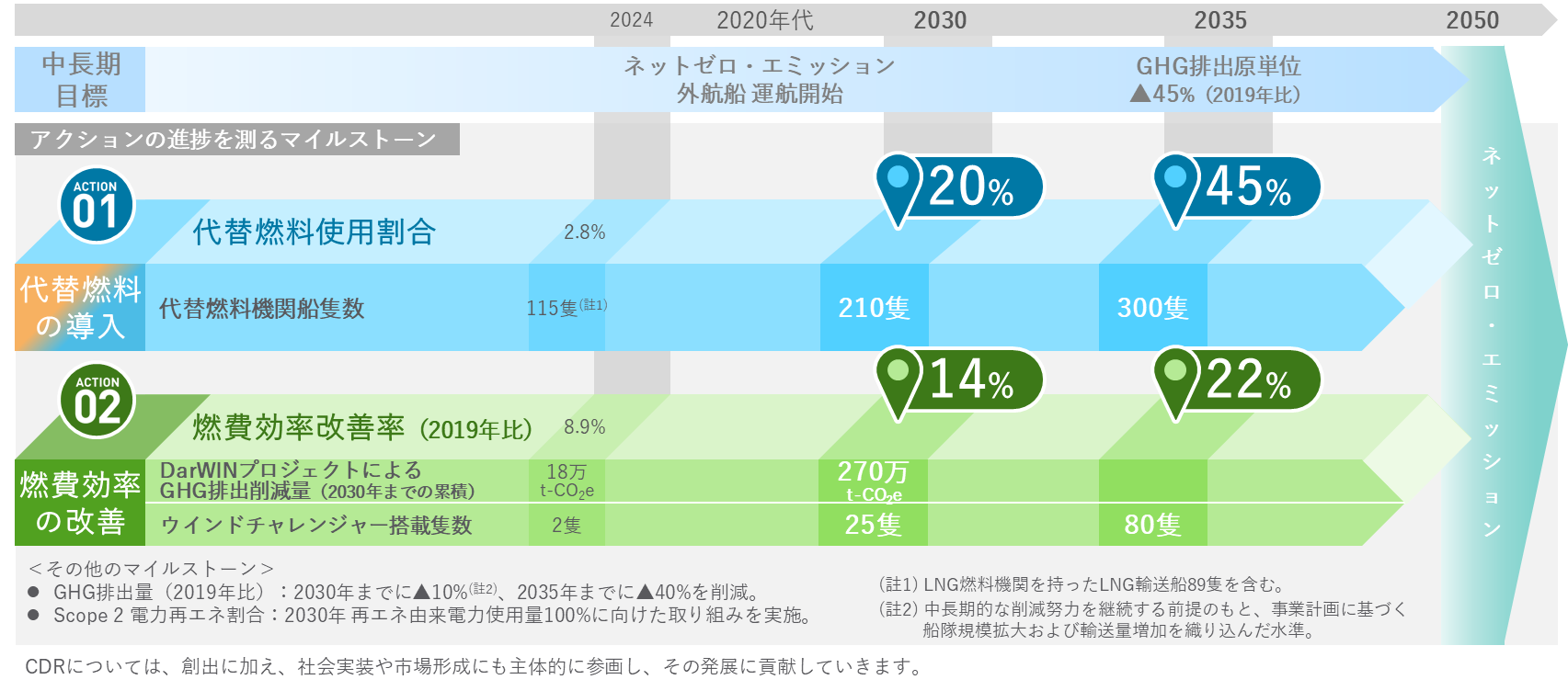 「商船三井グループ 環境ビジョン」で掲げる各目標、マイルストーンの実現に向けて着実に歩みを進めています。