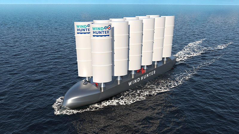ウインドハンターのコンセプトは、多数のウインドチャレンジャー型帆を船上に搭載し、化石燃料を必要とせず、風の力で航行します。また、船が風の力で進む際に水中タービンを回して発電し、その電気で海水から得た水を電気分解して水素を生産、船上に貯蔵します。