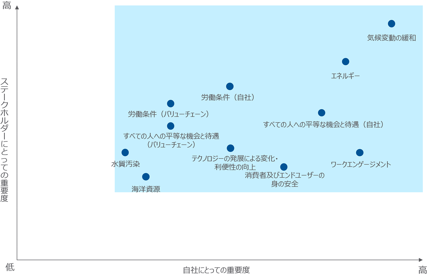 ステークホルダー軸については、投資家・株主、顧客、取引先、従業員、NPO・NGOとのこれまでのエンゲージメントの記録を参照するとともに、投資家・株主には別途ヒアリングやアンケートを実施し、重要性を評価しました。
