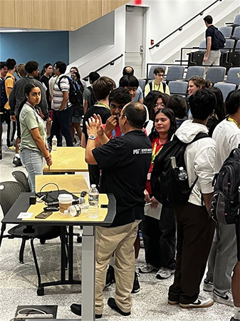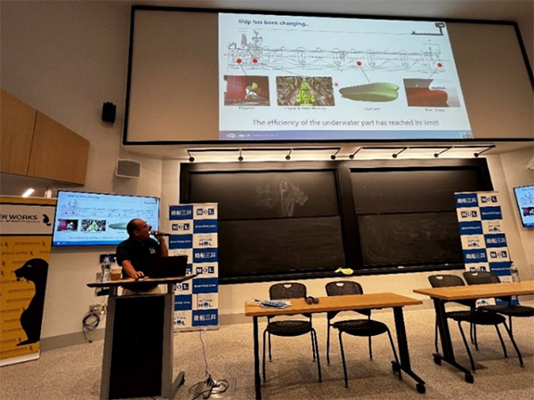 また、BWSI参加者向けに世界有数の企業や教授が講演を行うセミナーシリーズにおいて、当社船舶技術ユニットの大西暢之が講演を行いました。大西は、対面会場参加者150名、オンライン参加者270名を含む400名超の学生に対し、当社が140年以上にわたって蓄積してきた船舶および海洋における知見を基に、ウインドチャレンジャー(硬翼帆式風力推進装置)技術をはじめとする環境保護に向けた当社の取り組みについて講義しました。