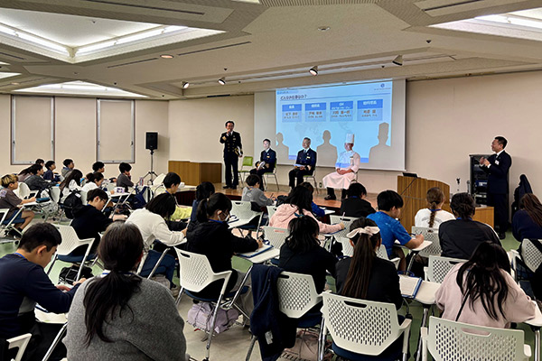 当日は商船三井クルーズから船長、機関長、ゼネラルマネージャー、総料理長による特別講話も行われ、船の運航や安全管理、サービス品質、食のこだわりなどの多岐にわたる専門的な業務とその面白さを伝えるとともに、クルーズ事業を志したきっかけなども紹介しました。また、名古屋港管理組合による「名古屋港の役割と海事教育」に関する講話を実施し、港湾の歴史や物流の重要性を学ぶことで、海事産業の幅広い視点を得る機会となりました。
