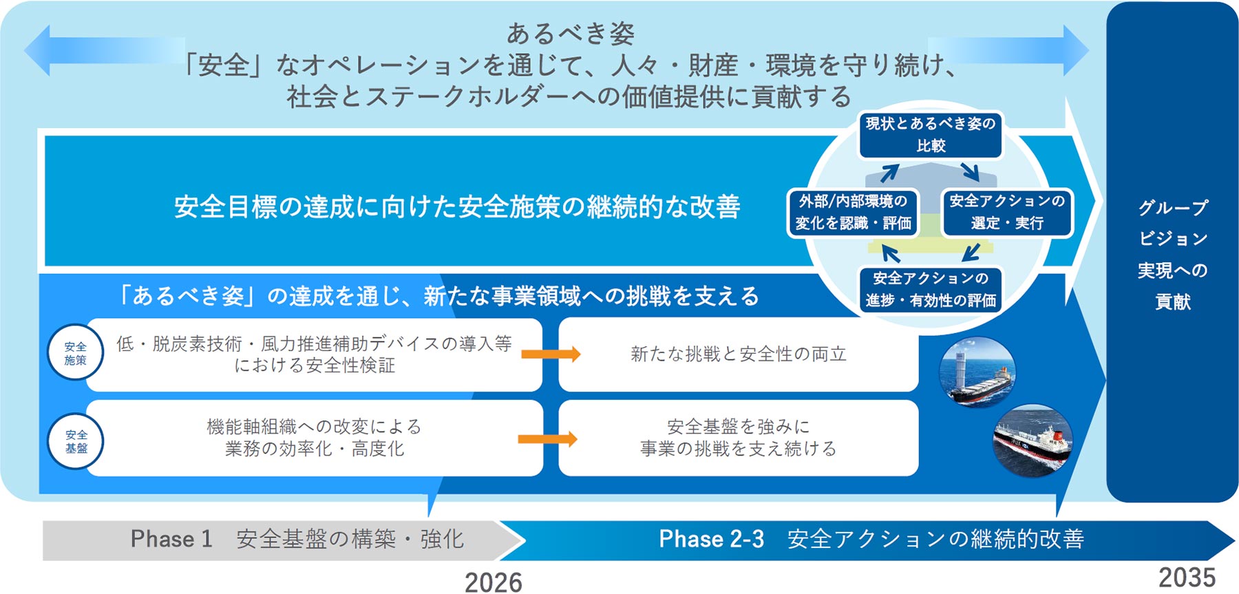 安全ビジョンの「あるべき姿」を達成を通じ、新たな事業領域への挑戦を支えることで、商船三井グループビジョン実現へ貢献していきます。