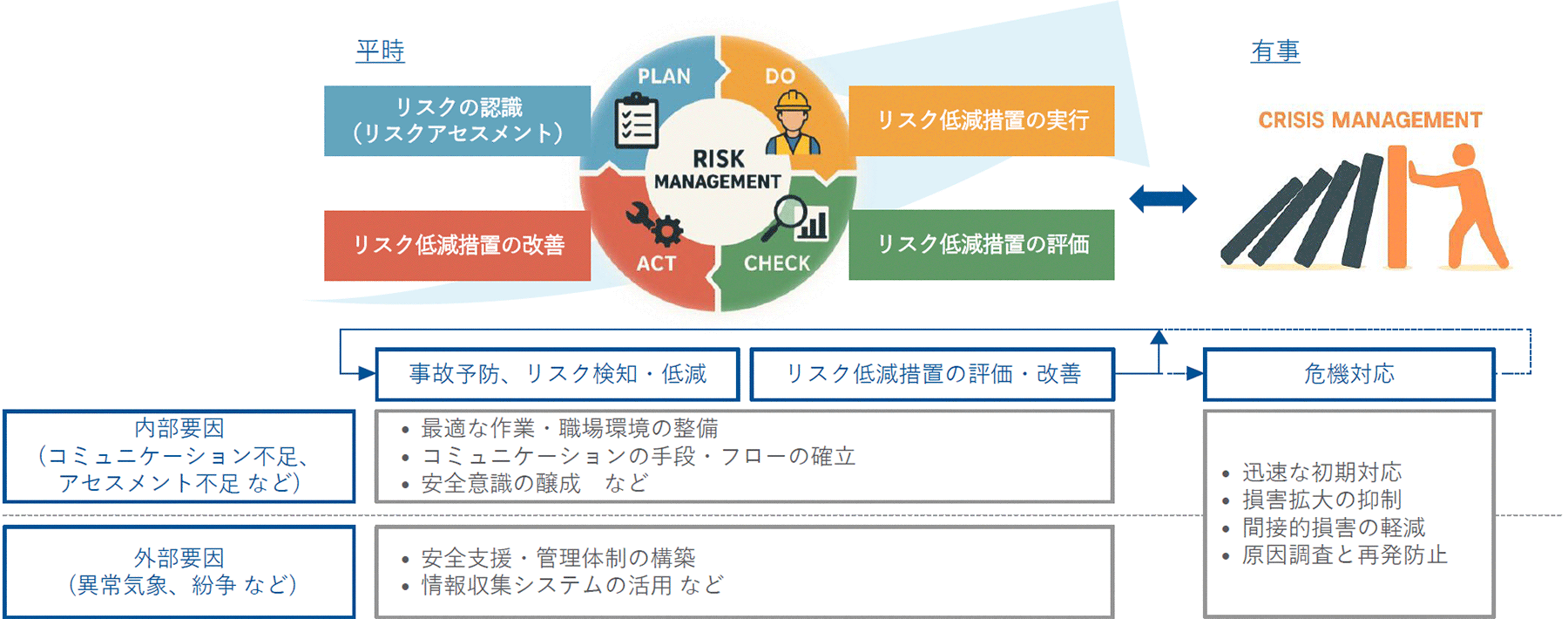 さらに、有事の際は「クライシスマネジメント」により二次被害を防止した上で、再び「リスクマネジメント」に回帰し、“安全な状態”を担保しなければなりません。