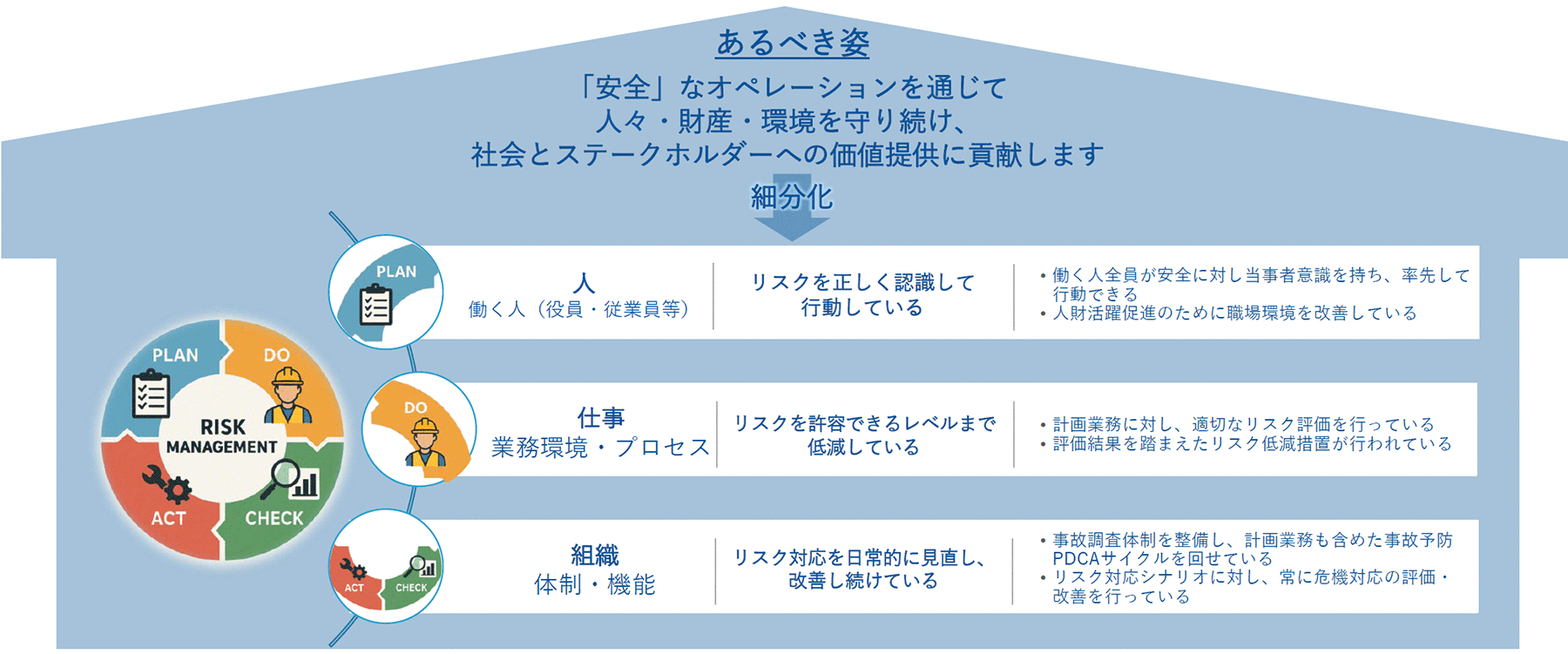 安全ビジョンは、あるべき姿を示す屋根部分と、実現のための取り組み(安全アクション)を示す柱・基礎部分で構成されます。