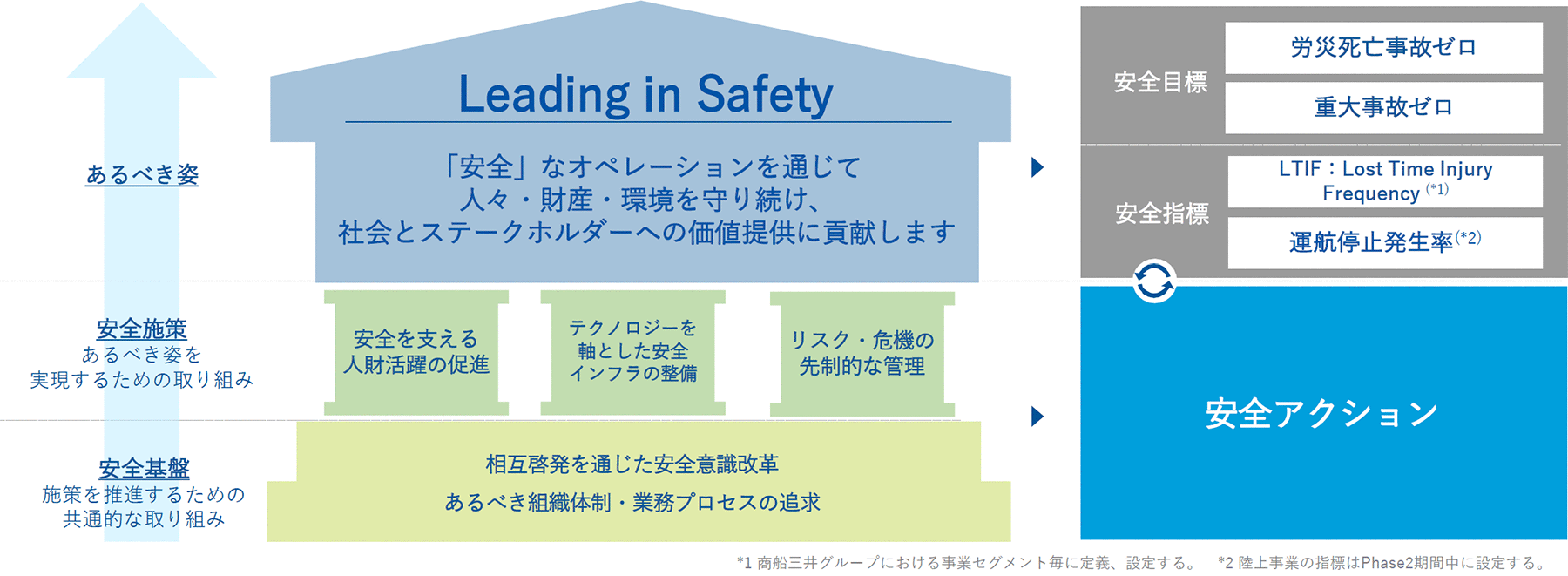 そして、安全ビジョンは、海上・陸上を含むすべての事業活動における当社グループの「安全」に関する目標およびあるべき姿を内外のステークホルダーに明らかにし、グループ全役職員が目指す共通の方向性を示すために策定されたものです。