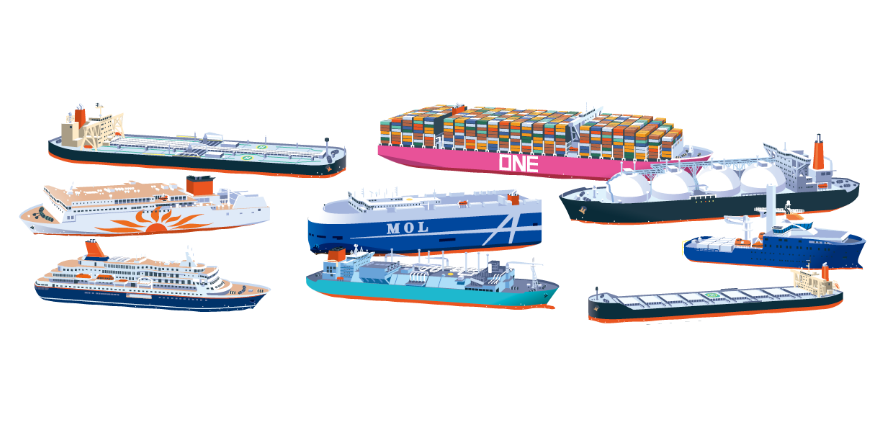 ヨット、漁船、艦艇などさまざまな種類がありますが、人や貨物を運ぶための船を「商船」と呼びます。